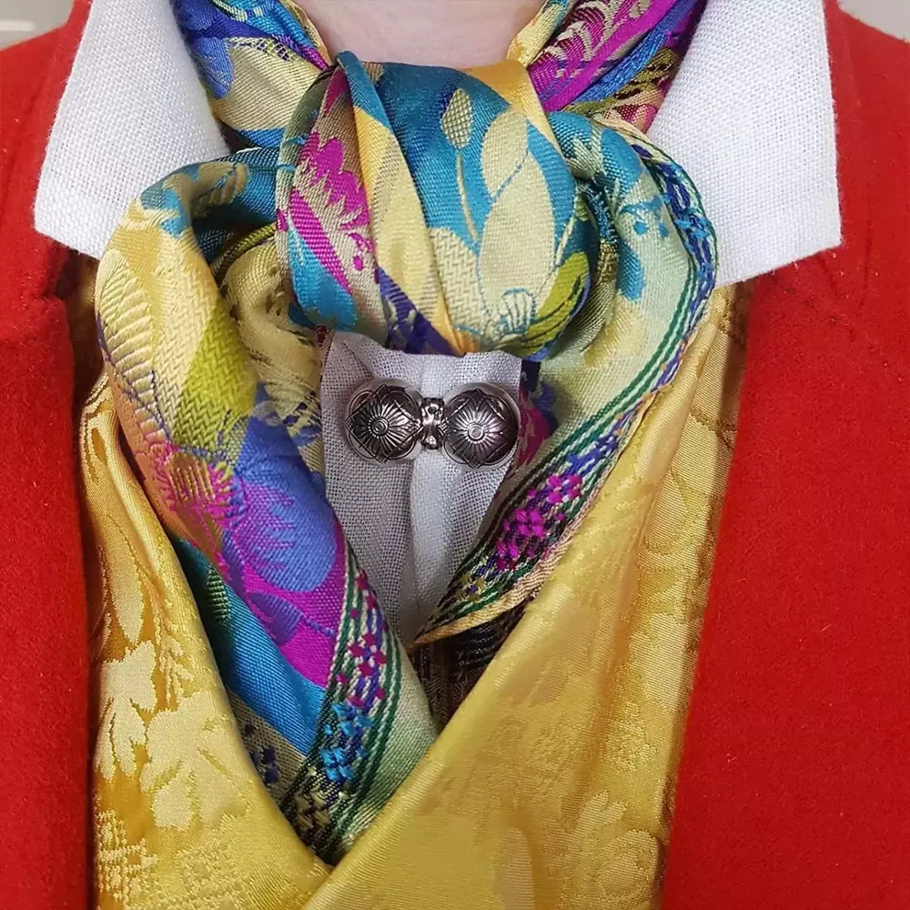 - Halsknapp: En liten nål festes helt øverst i halsen, rett under silkeskjerfet.