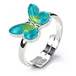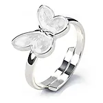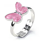 Denne nydelige ringen er laget i 925 sølv og dekorert med rosa glassemalje som gir ringen et mykt, glitrende uttrykk. Sommerfuglen er både søtt og klassisk, og siden ringen kan justeres kan barnet vokse med den.