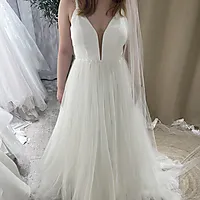 Elegant og tidløs brudekjole fra anerkjente Rosa Clará, modellen er fra 2002. Kjolen kombinerer klassisk romantikk med et moderne snitt – perfekt for deg som ønsker et stilrent og sofistikert uttrykk på den store dagen. Kjolen har en flott V-utringning foran og åpen rygg som gir et feminint og elegant preg. Det delikate livet med mønstrede stropper gir en subtil overgang til det myke, luftige skjørtet