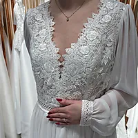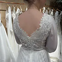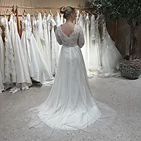 Elegant og romantisk – denne brudekjolen Bianco Evento «Debora» er designet med en klassisk A-linje som gir en lett og flytende silhuett. Den har lange ermer og en raffinert Queen Anne-utringning, mens ryggen avsluttes i en elegant V-form som balanserer dekning og åpenhet. Utført i tidløs elfenbensfarge, er denne kjolen ideell for bruden som ønsker en harmonisk kombinasjon av tradisjon og moderne finesse.