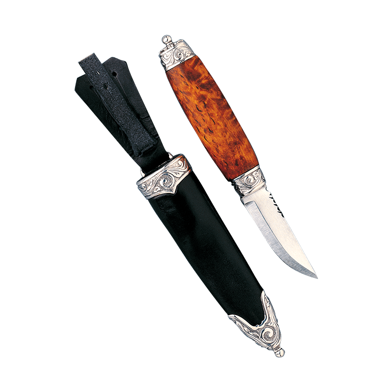 Bunadskniv Ola - Flott bunadskniv til herre og et fint tilbehør til bunaden. Olakniven har håndsmidd blad og er laminert med en herdet stålkjerne i midten. Skaftet er laget av masurbjørk, som med sitt særpreg gir kniven et unikt utseende. Sort, håndsydd slire ogakantusholker i sølv på både skaft og slire. Et riktig godt norsk håndverk som passer til de fleste bunader!
