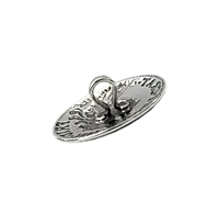 Myntknapp til bunad i 830 oksidert sølv. Det var vanlig å lage knapper av sølvmynter før i tiden, og denne knappen er en videreføring av den gamle tradisjonen. På knappen står det Frid 1111 Dei Grat. Det står for Fredrik den store, kongen av Danmark og Norge i 1699-1730 - Den fjerde i rekken. Disse skal sys på jakker, vester og bukser.