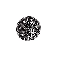 Bunadsknapp i oksidert sølv med filigrandekor. Denne knappen passer til bunadene: Numedal – Flesbergdrakt, Vest-Telemark, Øst-Telemark og Numedal – Skjælingsdrakt.