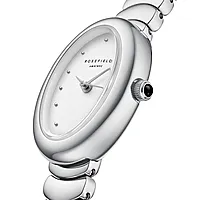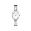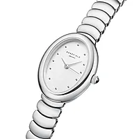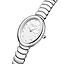 Denne elegante klokken er dekorert med et sofistikert, ovalt urkasse-design med en stilren sølvfarget finish. Det feminine uttrykket gir klokken et moderne, men samtidig tidløst preg som passer perfekt til både hverdagsbruk og mer pyntede anledninger.