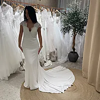Elegant og sofistikert — Pronovias Milady er en brudekjole som kombinerer klassisk silhuett med moderne detaljer. Kjolen har en flatterende «mermaid» / fishtail-passform som fremhever figurens former, med en feminin V-utringning foran og en lav V-rygg for et elegant bakansikt. Toppen er laget i raffinert blonde med blomsterdetaljer og subtile paljetter eller glans, som gir en delikat kontrast mot det glatte, moderne krepp-stoffet i skjørtet. De korte «cap»-ermene gir kjolen et romantisk og tidløst uttrykk, og overgangen fra blondetoppen til det strømlinjeformede skjørtet er stilfull og sømløs.
