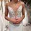 Overdelen er laget med delikat blonde og paljettbrodert “illusion”-effekt, og byr på en dristig V-utringning med tynne, perle-besatte spaghetti-stropper — en kombinasjon som gir en sofistikert og tidløs sensualitet. Kjolen har en glatt, stilren crepe-skjørt som gir en minimalistisk eleganse, og bak er det en klassisk lav rygg og full lengde med kapell-slep.