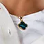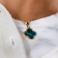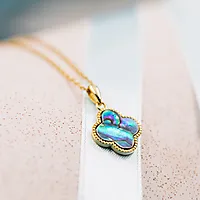 Smykke med kløver av abaloneskjell, kjent for sin utrolige styrke og perlemorsglans på innsiden, med farger i regnbuens spekter.