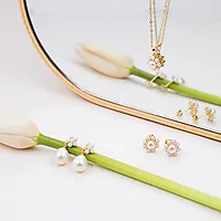 Øredobber med blomst av perler i forgylt sølv, hvor hvert kronblad en en glansfull ferskvannsperle. Et feminint og tidløst smykke som passer både til hverdags og fest.