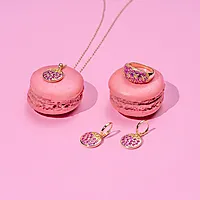 Shine ring med en bred ringskinne besatt med glitrende, rosa og gule zirkonia. En festklar ring som fanger lyset og gir antrekket et glamorøst løft. Kommer også i smykke og øreringer, samt i flere farger.