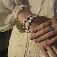 Armbånd fra kolleksjonen Solstice kombinerer glitrende opalhvite stener med bohemske detaljer som fremhever skjønnheten i det naturlige og uperfekte. Perfekt til den feminine, bohemske trenden som preger motebildet nå.
