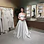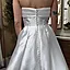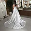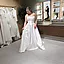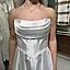 Kjolen har en nydelig korsettinspirert overdel med struktur som former midjen på en utrolig flatterende måte. Den elegante drop-waisten går over i et voluminøst A-line skjørt med vakre folder som gir et dramatisk og luksuriøst uttrykk. Stoffet er laget i eksklusiv, perlemorsskimrende Mikado, som gir kjolen et rent og sofistikert fall. Baksiden er dekorert med en rad elegante knapper hele veien ned til slepet, noe som gir et klassisk og romantisk preg. Resultatet er en silhuett som fremhever midjen samtidig som skjørtet gir en vakker og majestetisk form.