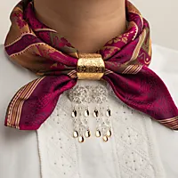 Skjerfring til silkjeskjerf i 830 forgylt sølv, laget for å holde skjerfet vakkert og trygt på plass. Denne ringen har gravert mønster med samme formspråk som annet bunadsølv slik at det skaper et gjennomført uttrykk.
