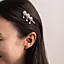 Hårnål til bunad i 830 hvitt sølv med dekorativ filigransrosetter og blanke dryppløv. Nålen holden håret stødig på plass og løfter både bunad og andre festlige antrekk