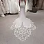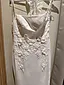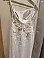 Kjolen har en elegant, kroppsnær silhuett i myk crepe som faller vakkert nedover kroppen. Overdelen har en moderne firkantet utringning og delikate spagettistropper, samt nydelige 3D-blomster med perler som gir et subtilt og romantisk preg. Baksiden er åpen med vakre blondedetaljer, og kjolen avsluttes med et spektakulært slep i brodert blonde og tyll med scallop-kant.