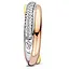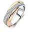 Feire moderne eleganse med denne stilfulle ringen fra Ti Sento. Laget i 925 sterlingsølv, forener de tre edle nyanser – strålende forgylt gult gull, mykt forgylt rosegull og kjølig platinaforgylling – i et elegant kryssende design. En bue av pavéinnfattede hvite zirkonia glitrer langs forsiden og fanger lyset i hver bevegelse. Den skulpturelle formen gir ringen dybde og kontrast, mens den kompakte størrelsen gjør den perfekt til hverdagsbruk med et raffinert preg.