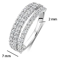 Denne zirkonia-ringen er et elegant statement-smykke laget av høykvalitets 925 sterlingsølv. Ringen er besatt med briljantslipte zirkoniastener som gir et iøynefallende uttrykk og en vakker lysrefleksjon fra flere vinkler. Ringens slanke rader sitter på en sofistikert måte og fremhever designets form.Perfekte å bruke alene for et rent statement – eller sammen med andre sølvsmykker for en mer personlig stil.