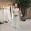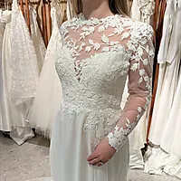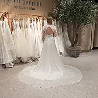 Kjolen har en flatterende A-line silhuett i myk chiffon, som gir et lett og luftig fall og en naturlig bevegelse i skjørtet. Overdelen er laget i transparent blonde med høy hals og lange ermer, noe som skaper et raffinert og elegant uttrykk med en moderne twist. Den delikate blonden gir dybde og struktur, mens den lette chiffonen i skjørtet tilfører en svevende og romantisk følelse. Skjørtet har lag på lag og en diskret splitt foran, som gir et hint av sensualitet og bevegelse uten å ta bort det klassiske uttrykket. Baksiden fullføres med en elegant keyhole-åpning, som gir kjolen et sofistikert og moderne preg