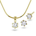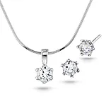 Klassisk smykkesett i rhodinert sølv med halssmykke og øredobber som er dekorert med skinnende zirkonia. Smykket leveres med et slangekjede i sølv som er 0,7 mm bredt og 45 cm langt. Selve anhenget på smykket er 10 mm høyt og 4,5 mm bredt. Øredobbene er 4,5 mm i diameter. Dette er et tidløst smykkesett som passer like godt til hverdag som til fine anledninger.
