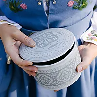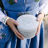 Det indre skrinet er lufttett og i tre etasjer. Sølvet holder seg blankt og fint i lang tid og rommer alle smykkene til din bunad. Det er viktig at du lar det indre skrinet stå i porselensskrinet slik at det ikke kommer lys til.