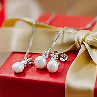 Oppdag det vakre smykkesettet i sølv, perfekt for å gi ethvert antrekk et elegant løft. Settet består av et stilrent smykke og matchende øredobber, begge dekorert med glitrende zirkonia og en klassisk perle av perlemor.