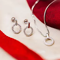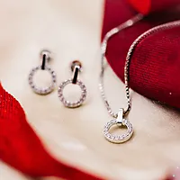 Tidløst sirkelsmykkesett i 925 sølv med glitrende zirkonia stener. Settet består av smykke og øredobber. Lengden på kjede er 45 cm.