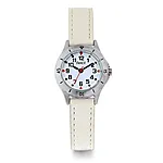 Gi barnet en enkel og praktisk klokke som både er pen og lett å bruke: denne barneklokken med hvit rem og skive er ideell for barn som vil lære seg klokka.