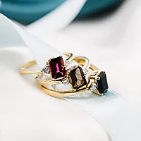 Stentype Rhodolitt, Diamant Materiale 585 Gult gull Bredden på ringskinne i mm 2 Leverandørens varenummer 59713 MålforandresKan målforandres opp med 2 størrelser