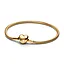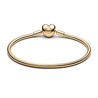 Det ikoniske slangekjedearmbåndet har fått en skinnende oppdatering. Den hjerteformede låsen på dette 14 karat gullbelagte armbåndet har en gravert Pandora-logo på den ene siden og den ikoniske Pandora Crown O-en på den andre.
