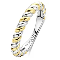 La deg begeistre av den skulpturelle glansen i denne ringen fra Ti Sento. Laget i 925 sterlingsølv, kombinerer designet speilblanke platinaforgylte partier med strålende gullforgylte ledd som skaper en dynamisk rytme rundt fingeren.Ringen er dristig nok til å bæres alene, men smal nok til å kombineres med andre smykker – like perfekt til jobbantrekket som til kveldslooken.