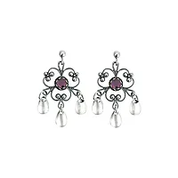 Bunadsøredobber i 830 oksidert sølv med tradisjonell filigrandekor og blanke dryppløv. Velg mellom lilla, grønn, blå eller rød sten i senter. Flott tilbehør til bunaden og ikke minst, en fin gave til konfirmanten eller den som har alt. Passer til flere bunadene i landet.