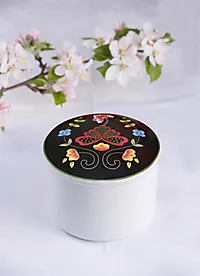 Det indre skrinet er lufttett og i tre etasjer. Sølvet holder seg blankt og fint i lang tid og rommer alle smykkene til din bunad. Det er viktig at du lar det indre skrinet stå i porselensskrinet slik at det ikke kommer lys til.