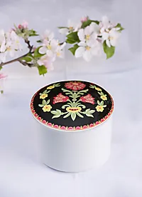 Det indre skrinet er lufttett og i tre etasjer. Sølvet holder seg blankt og fint i lang tid og rommer alle smykkene til din bunad. Det er viktig at du lar det indre skrinet stå i porselensskrinet slik at det ikke kommer lys til.
