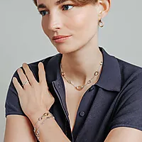 Nydelig statement smykke i sølv dekorert med forgylte ovale ringer som skaper et ekstra blikkfang. Den midterste ovale ringer er dekorert på hver side med glitrende zirkonia. Kjedet kan justeres mellom lengde 38-48 cm. Finnes tilhørende øredobber.