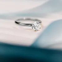 Den briljantslipte LAB-diamanten er 1,00 ct og gir et vakkert, levende lys, mens det rene designet i hvitt gull fremhever diamantens naturlige glans. Den høye fatningen gjør at den passer fint også i kombinasjon med andre ringer.