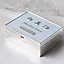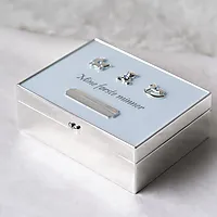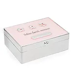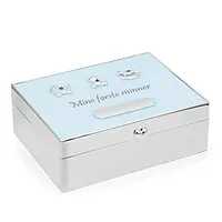 Et vakkert og tidløst minneskrin for de verdifulle øyeblikkene i barnets første leveår. Dette lyseblå skrinet er designet for å samle og bevare små skatter som minner om første smil, første hårtotten, første sko og andre dyrebare øyeblikk du ønsker å ta vare på for alltid.