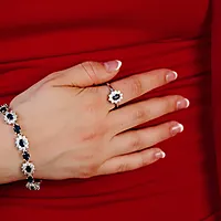 Royal ring i 925 rhodinert sølv med blå zirkonia sten i senter, omkranset av glitrende hvite zirkonia. En tidløst og sofistikert ring som skiller seg ut, for den som ønsker det lille ekstra.