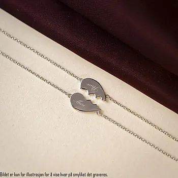 Gravering: Teksten blir vannrett på midten av hver hjerte del. Om du ønsker begge halvhjertene gravert legger du en skråstrek i mellom.