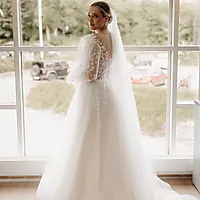 Drøm deg bort i denne A-linje brudekjolen i lys nude-tone med et elegant slep. Kjolen er laget i et glitrende mesh-stoff som fanger lyset og gir et subtilt skimmer ved hver bevegelse. De voluminøse ermene avsluttes med romantiske mansjetter og rysjer som gir et luksuriøst preg. Et delikat bolero i hudtone festes med knapper i ryggen, mens selve korsettet lukkes med glidelås og har en skjult snøring for perfekt passform. Kjolen er rikt dekorert med to typer blonder, brodert med glitrende paljetter og perler som gir en sofistikert og detaljrik finish.