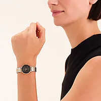 Denne klokken kombinerer minimalistisk eleganse med et moderne tonet uttrykk. Den kompakte kassen på 26 mm gir en diskré, men sofistikert tilstedeværelse på håndleddet. Lenken er laget av gull- og sølv-belagt rustfritt stål, noe som gir modellen en luksuriøs, men samtidig allsidig karakter.