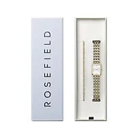 Dette elegante gave-settet kombinerer den klassiske Rosefield Octagon XS Duotone-klokken med et matchende Multi Crystal-armbånd. Klokken har et kompakt, åttekantet urhus (19,5 × 24 mm) og en raffinert to-tonet lenke i gull og rhodium, noe som gir et stilig og tidløst uttrykk.